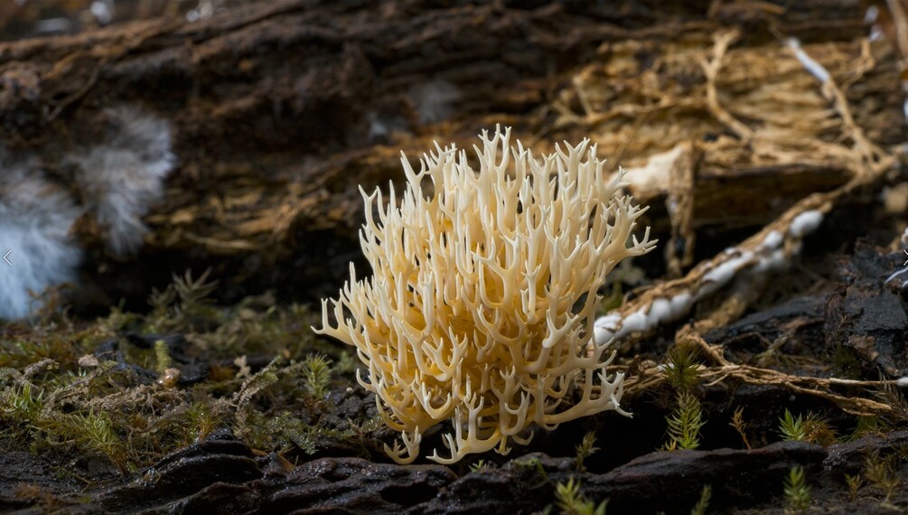 4K video clip of an Artomyces species of mushroom growing